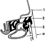 4. Установите раму стекла так, чтобы расстояние (а) между внешней кромкой стекла (3) и декоративной полоской на крыше (1) было 6,5±1 мм (при закрытой двери) и уплотнение (2) было немного сжато.
